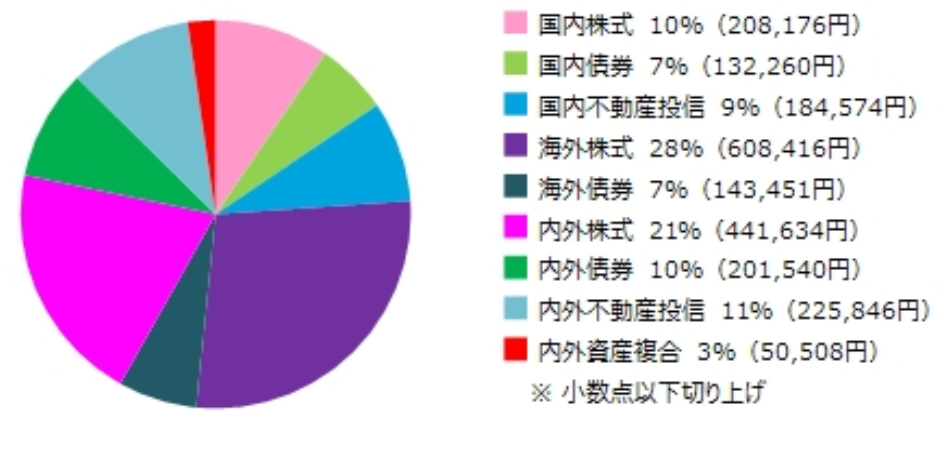 次に、運用状況の中で資産配分に焦点を当ててみましょう。まず、筆者の資産配分は以下の通りです。海外株式が最も多くを占めていますが、かなり分散されています。