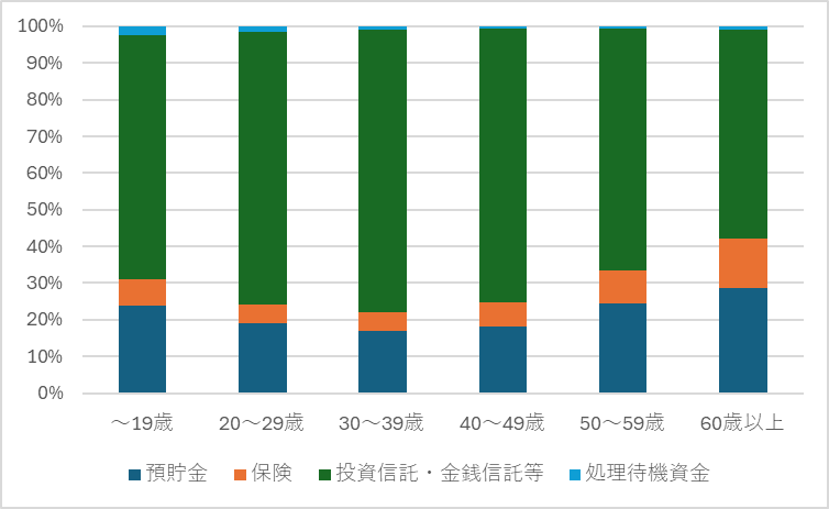さらに、2024年3月末時点における運用状況のうち、運用商品の割合を年齢別にチェックしてみましょう。19歳未満の方々は、投資を開始して間もないため、約31%が元本確保型で運用されております。これは、企業型確定拠出年金などにおいて、デフォルトの選択肢が元本確保型であることが影響している可能性が考えられます。それ以降の20歳から49歳までは、元本確保型の割合が20%台前半であり、50歳代は34%、60歳以上は42.1%と、より保守的な運用傾向が見受けられます。