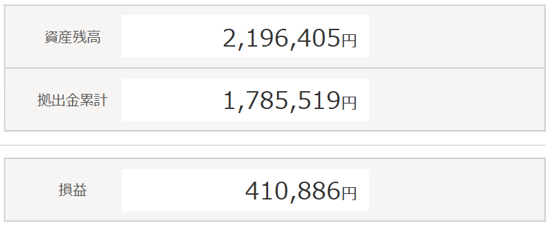 掛金累計の179万円に対し、資産評価額は約220万円であり、全体の損益は+23%となっております。
